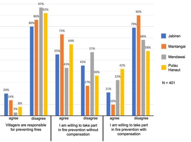 The failure of this prevention scheme perpetuates injustices to Indigenous Dayak people who make up the majority of the fire teams. The decentralisation of fire governance has drawn on this community to take on frontline roles in fire management and firefighting, where they are exposed to poisonous haze and intense heat. For their participation in these groups governmental agencies and also corporations that need help to supress fire from their concessions, pay the ‘volunteers’ Rp 100,000-150,000 (AU$10-15) per day. As our surveys found (Graph 1), despite these risks, overwhelmingly, the Dayak are willing to accept responsibility for preventing the fires and do all they can to assist. A severe lack of job opportunities and declining livelihood options, means people salvage whatever chance is offered to them. Such economic benefits are nothing compared to the devastation these fires bring to their lands and culture.